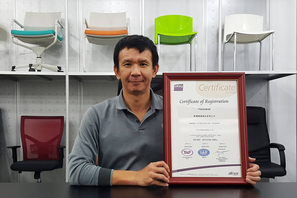 隨著景氣上揚,新傳辦公椅工廠業績亦蒸蒸日上,紀尚德在創業之初即投注電腦化作業的前瞻思維,使得產銷整體的維運管理,得以精準且效率化的落實。因為有此基礎,紀尚德帶領全體員工齊心協力實踐品管機制,於2016年順利獲取ISO認證。ISO認證其主要精神即PDCA,亦指全面品質管理所應遵循的科學程序,依據質量計劃的制訂和組織實現的過程,新傳公司從年度計畫的確立,再透過實際執行,最後總結檢討成效,針對其經驗或推廣或改進。科學化管理系統與制度讓新傳公司提升業績亦形塑優良的品牌形象。