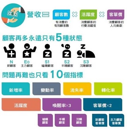 客戶的五種狀態則是根據消費者具體的購買行為所建立的「NES 模型」,將消費者分為新顧客 N (New Customer)、既有顧客 E (Existing Customer)、沉睡顧客 S (Sleeping Customer)。再依據顧客的消費變化進一步區隔為五種狀態,將既有顧客再細分為主力顧客 (E0) 、瞌睡顧客 (S1) 和半睡顧客 (S2)。而攸關營運績效的十個指標則是顧客的「新增率」、「變動率」、「流失率」、「轉化率」、「活躍度」、「顧客喚醒率 (瞌睡顧客喚醒率、半睡顧客喚醒率、沉睡顧客喚醒率)」和「客單價 (新顧客客單價、主力顧客客單價)」