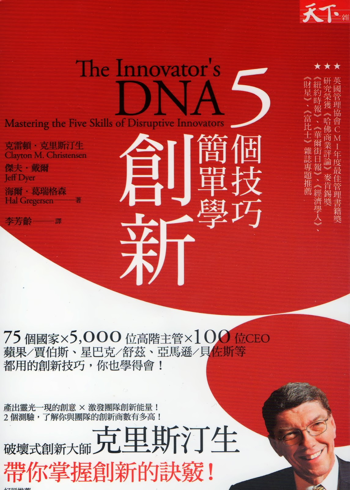 在一片追求創新, 創意, 創業的浪潮聲中, 這一本由 破壞式創新大師 克雷頓 . 克里斯汀生 (Clayton Christensen) 所主筆的本書無疑的是大師一系列著作中最精華的一本. 一直以來我們都認為創意與創新是靠靈感偶然的迸現也就是 “ 靈光乍現 ” 的概念而得到的, 但其實不然, 創新與創意的產生是可以經由訓練而達成的, 作者與他的研究團隊訪談了數以百計的知名創新公司的 CEO 而歸納出創新與創意的點子是經由以下這五個技巧訓練出來的